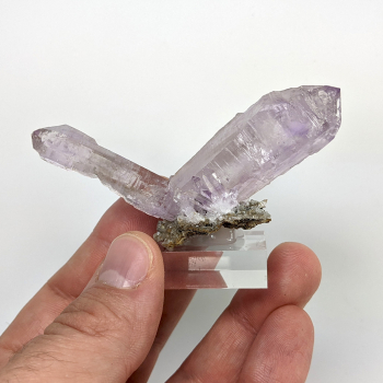 Paire de cristaux d'améthyste légèrement sceptrés et fenestré pour le plus gros.Cette pièce provient de Las Vigas, État de Véra Cruz, au Mexique.Elle mesure 7,6 cm de long (entre les pointes des cristaux) pour 3 cm de haut et 2,8 cm d'épaisseur à la base.Son poids est de 38 grammes.(Mesures hors...
