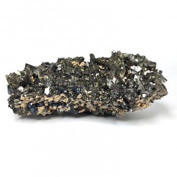 Riche association d'arsénopyrite brillante, de pyrrhotite recouverte de pyrite, de rhodochrosite et de sphalérite.Pièce provenant du complexe de Trepča, vallée de Trepča, Mitrovica, district de Mitrovica, Kosovo.Elle mesure 12,2 cm de long pour 4,9 cm de large et 4,4 cm au plus épais.Son poids...