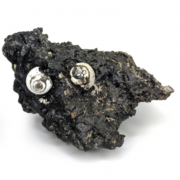 Pièce recouverte de bitume naturel, avec deux escargots fossiles d'hélix ramondi.Spécimen provenant de l'ancienne exploitation d'hydrocarbure de la mine des rois, Dallet, Puy-de-Dôme, Auvergne, France.Il mesure 10,8 cm de long pour 9,1 cm de large et 6,8 cm d'épaisseur, les escargots mesurent 1,7...
