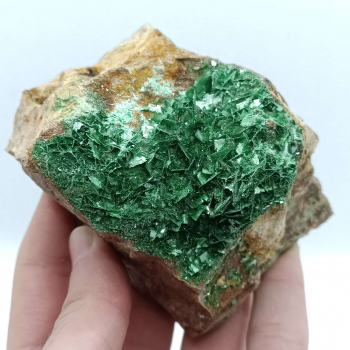 90 x 69 x 59 mm LCJD-0524 Les cristaux sont d'une belle couleur verte. Des zones de contacts sont à déplorer. A l'arrière, il y a un microplacage d'autunite.