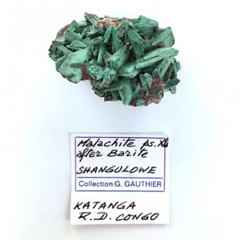 Pseudomorphose, malachite après barytine. Joli groupe de cristaux verts centimétriques, spécimen provenant de la mine de Shangulowe, Katanga, République Démocratique du Congo. Etiquette G.Gauthier.4 x 3 x 2 cmRéférence : 0040