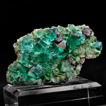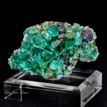 Beaucoup plus rare avec une association de cristaux de galène, cette pièce provient de la célèbre blue Pocket , fameuse pour sa couleur très lumineuse qui varie à la lumière du jour avec des nuances violettes. Cette pièce est également remarquable par l'absence de défaut majeur sur les cristaux...