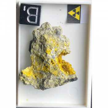 Mine de Shinkolbwe, Kambove, Katanga, R. D. du Congo. Spécimen 3 x 3 x 1cm avec une géode recouverte de microcristaux jaunes d’uranophane, un urano-hydroxy-silicate de calcium. Minéral radioactif Référence : 00239
