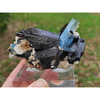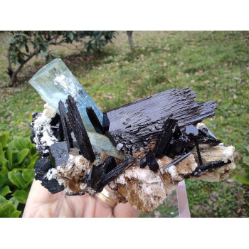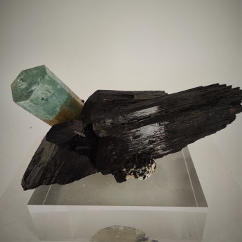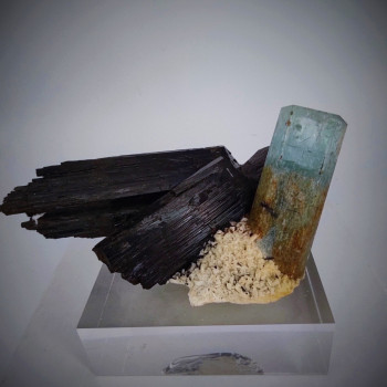 Beau cristal d'aigue marine associé à de la tourmaline noire9 x 5 x 3,5 cmRéférence : 0249