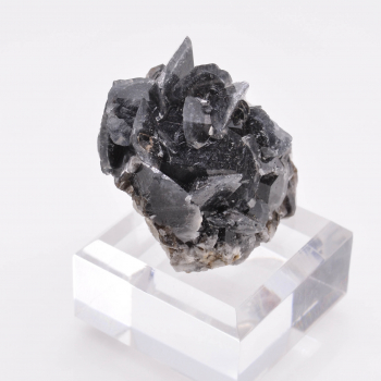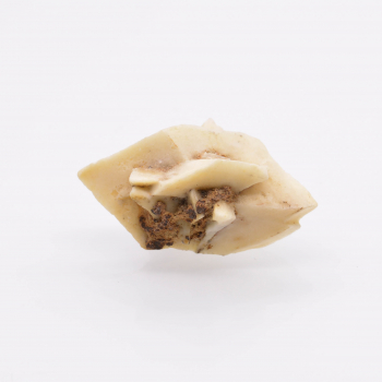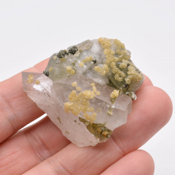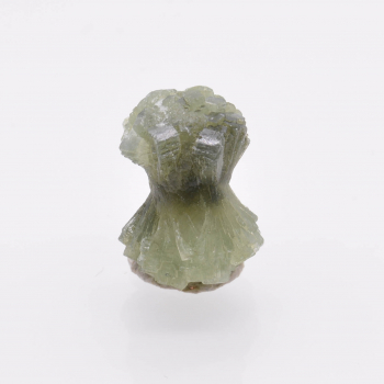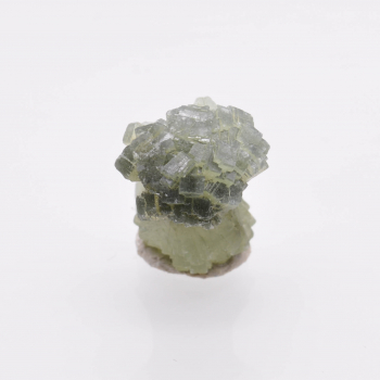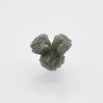 Nouvelle découverte (printemps 2022) de petits groupes flottants de prehnite en nœud papillon. Les cristaux de couleur vert bouteille sont plutôt brillants et bien terminés, et associés à de microcristaux fibreux (actinolite), bien visibles à la loupe. 1,5 x 1,2 x 1,1 cm. Référence : 2435-LM2T