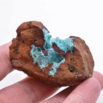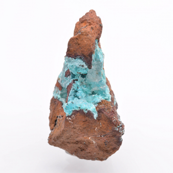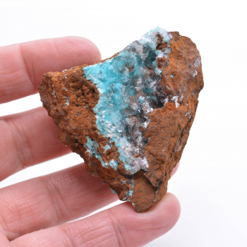 Aurichalcite bleu turquoise présente sous des cristaux incolores et brillants de calcite, donnant un effet "glassy", sur gangue de limonite orangée. 5 x 4,5 x 2,5 cm. Référence : 1944-LM2T