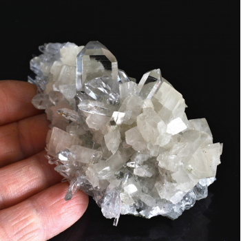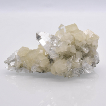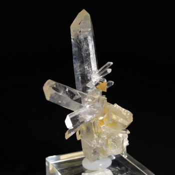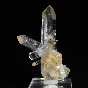 Petit groupe de quartz de la célèbre mine de La Gardette en Isère. Vu d'un côté, on reconnaitra le classique habitus du dauphiné pour le cristal principal. De l'autre, on notera la présence originale d'un cristal tabulaire biterminé, ainsi qu'un tétraèdre de chalcopyrite en association. 5,5 x 3,5...