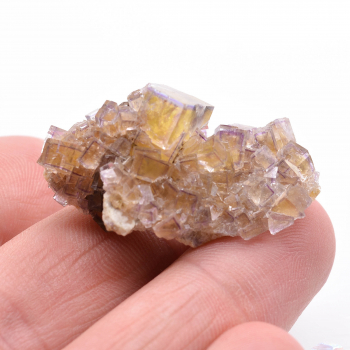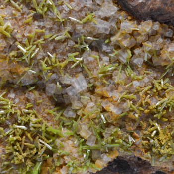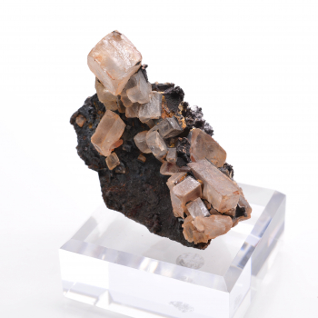 Beau petit ensemble de cristaux d’albite beige, parfois gemme, associés à de petites pointes de quartz à fantômes chloriteux et à de la sidérite rouge.4,2 x 3 x 2,7 cmRéférence : 0370