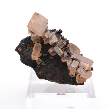 Beau petit ensemble de cristaux d’albite beige, associés à de petites pointes de quartz à fantômes chloriteux et à de la sidérite rouge.4,3 x 4 x 1,5 cmRéférence : 0371