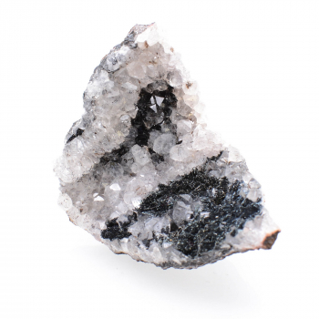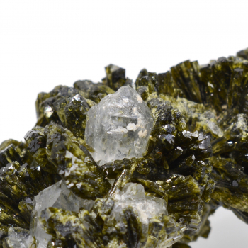 Pièce composée de cristaux d'épidote vert foncés bien brillants et bien terminés contrasté avec la présence de quelques quartz translucides. 5,7 x 3 x 2,9 cm. Référence : 2843-LM2T