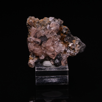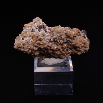 157 x 118 x 87 mmLCJD-0519Gros développement de cristaux de fluorite jaune recouverte d'un voile d'oxyde métallique noir avec des empreintes d'anciens cristaux de sulfures (?).A l'arrière, on découvre des cristaux négatifs de calcite.