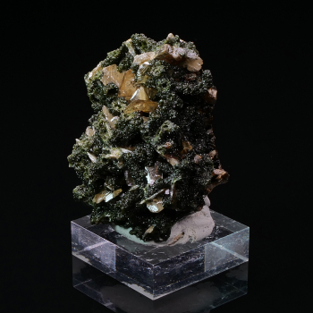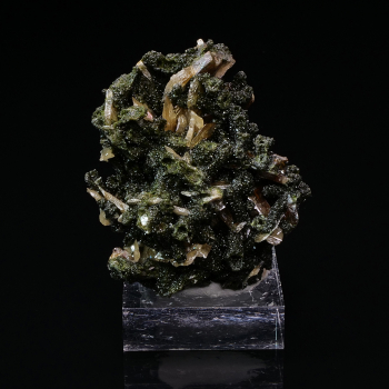 77 x 74 x 49 mmLCJD-0502Cristaux de libéthénite très brillants sur malachite. Un cristal présente une macle particulièrement bien marquée.