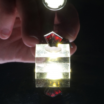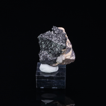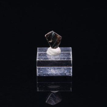 Macle Croix de Fer pour ce spécimen de pseudomorphose de Goethite après Pyrite. La Pyrite n’est plus du tout apparente en surface, tout est recouvert d’une fine couche de Goethite qui donne cet aspect marron noir brillant.3,80 x 3,80 x 3,50 cmRéférence : 1281