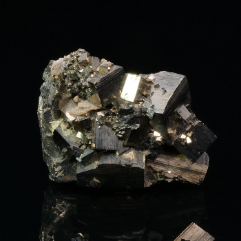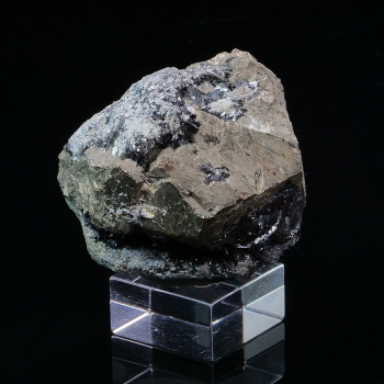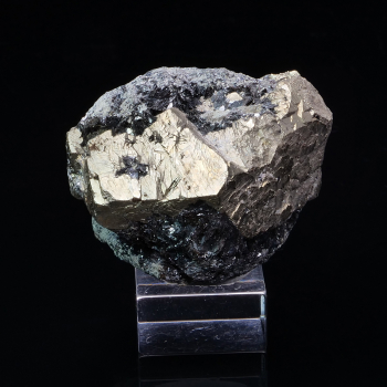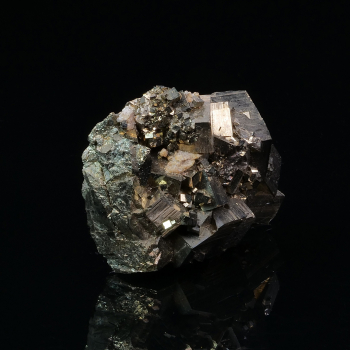 Macle Croix de Fer pour ce gros spécimen de pseudomorphose de Goethite après Pyrite. La Pyrite apparaît encore sur les arêtes en petites touches dorées. Bel aspect brillant dû à la fine couche de Goethite qui recouvre la Pyrite.4,80 x 4,50 x 4,40 cmRéférence : 1315