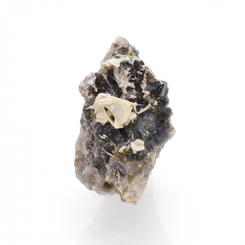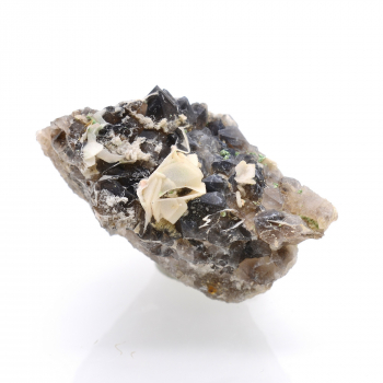 Intéressantes périmorphoses de calcite en quartz, sur quartz fumé. A noter, la présence minime de micro cristaux de torbernite. ! Petite pièce !4,5 x 3,8 x 2,5 cm.Référence : 3302-LM2T