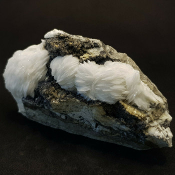 Baryte saupoudrée de bournonite sur une fine couche de quartz accompagné de sphalérite et bournonite.9,5 x 9 x 5 cm0010-SPAA