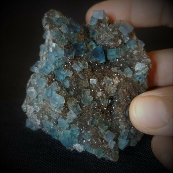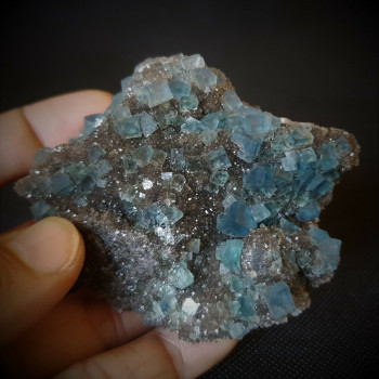 Petits cubes bleus de fluorite sur quartz fumé.8 x 6,5 x 3,5 cm0067-SPAA
