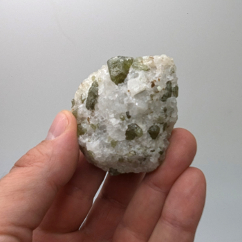 Pièce présentant des cristaux de diopside verts dans une gangue quartzeuse. Cet échantillon provient de Badakhshan en Afghanistan. Il mesure 5,2 cm de long pour 4,3 cm de large et 2,8 cm au plus épais. Son poids est de 71 grammes. Photos supplémentaires et commande en ligne sur le site DGminéraux...