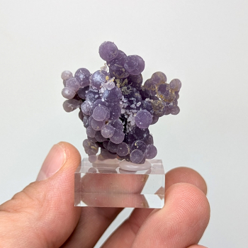 Calcédoine botroïde avec une couleur violette bien marquée et quelques cristaux de quartz millimétriques. Elle provient de Mamuju, Province de Sulawesi occidental, Indonésie. Cet échantillon mesure 3,4 cm de haut pour 3,5 cm de large et 2,5 cm d'épaisseur. Photos supplémentaires et commande en...