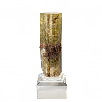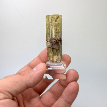 Grand cristal terminé d'apatite jaune citron avec une fracture re-cristallisée au milieu du cristal.Cet échantillon provient de la commune d'Imilchil, Midelt, Région du Drâa-Tafilalet, Maroc.Il mesure 5,5 cm de haut pour 1,8 cm d'épaisseur.Son poids est de 33 grammes.(Mesures hors socle)Photos...