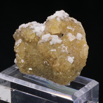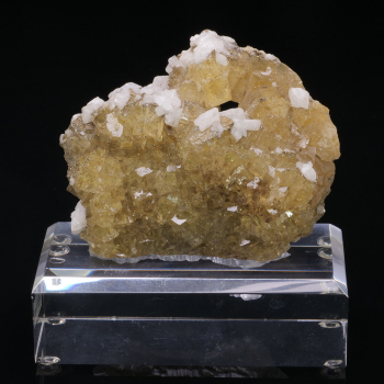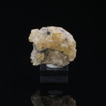 Spécimen de Fluorite jaune de Moscona en Espagne. Couleur jaune intense, les cristaux sont très bien formés et translucides. Association avec de la Baryte blanche et de petits cristaux de Pyrite qui apportent de la brillance à la pièce. Cette pièce est vendue avec son socle gravé sur mesure par...