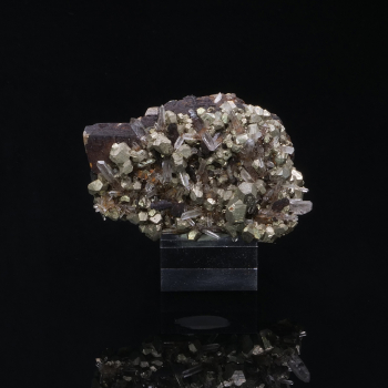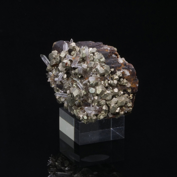 Joli spécimen brillant présentant des cristaux de Pyrite et de Quartz sur Sidérite provenant de la mine de Mésage en France. Découverte de 2015.4,70 x 3,10 x 2,40 cmRéférence : 3929