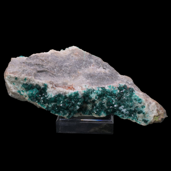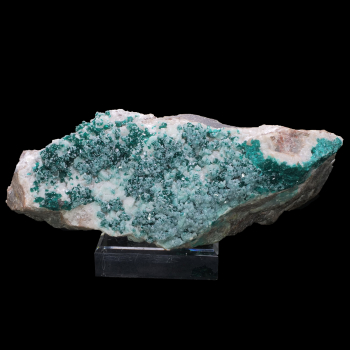 Spécimen très compliqué à photographier car il est cristallisé sur les deux faces opposées. Celle que nous voyons sur la première photo est couverte de cristaux de belle taille, bien formés et vert lustré. La seconde est également couverte de Dioptase, qui sont eux-mêmes couvert partiellement de...