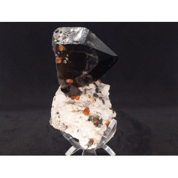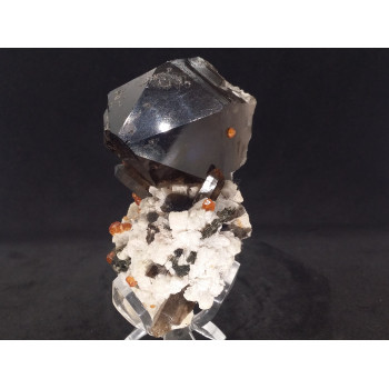 Quartz Fumé très foncé ornementé d'autres petits cristaux et surmonté de Grenats Spessartine, le tout royalement disposé sur une très jolie Microcline. Ce magnifique ensemble est un classique Chinois mais reste une pièce de collection à la fois très esthétique et de très grande qualité. Si vous...