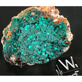 Tilwezembre, Katanga, R.D. du Congo. Carbonate de cobalt, spécimen 2,5 x 2,3 x 2 cm recouvert sur une face de sphérules rose violacé de sphaerocobaltite. Etiquette G.Gauthier Référence : 00244