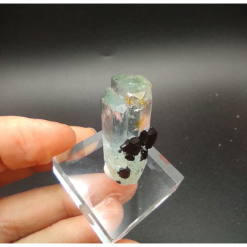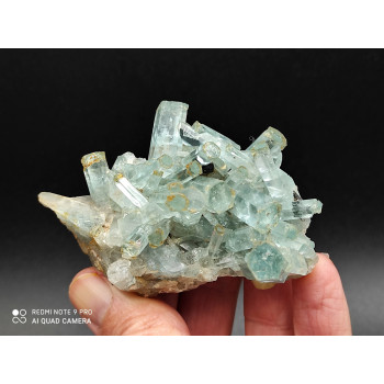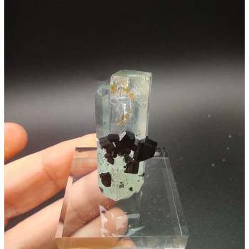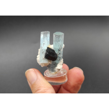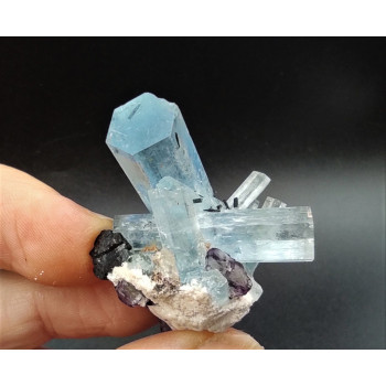 Cristaux d'aigue marine, le plus gros est biterminé, associés à de la tourmaline et de la fluorineAquamarine crystals, the biggest is biterminated, associated with tourmaline and fluorite4 x 3 x 3 cm0006-MDSA