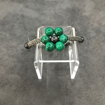 Bracelet en forme de fleur avec 6 perles Malachite et en son milieu 1 perle Hématite de 8mm. Sur le côté, vous y verrez 2 perles en Hématite de 6mm. Le tout est tressé sur fil ciré gris, hautement résistant dans le temps et à l'eau. Finition par 2 petites perles 6mm en Hématite. Taille ajustable...