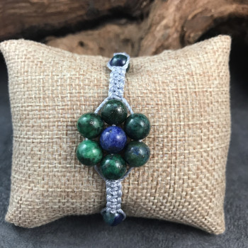 Bracelet en forme de fleur, avec 7 perles d'azurite malachite de 8 mm et 2 perles de 6 mm sur le côté, tressé sur fil gris très claire dit "Pearl", très résistant. Finition par 2 petites perles 6mm en azurite malachite Taille ajustable par nœuds coulissant (shambala)