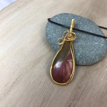 belle Jaspe "Cherry Creek" , sertie sur un fil de cuivre or (garantie sans plomb, sans nickel et sans cadmium) Dimensions de la pierre nue : 37,94 x 18,53 mm Cordon polyester ciré, avec fermoir pince de homard et chainette d'extension Provenance : Chine