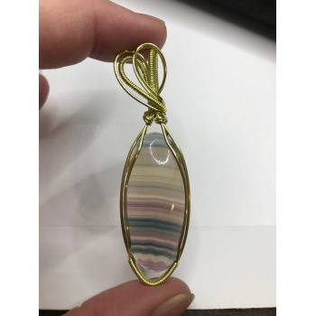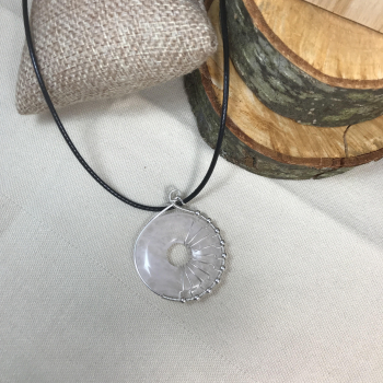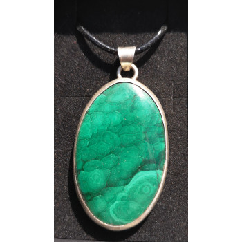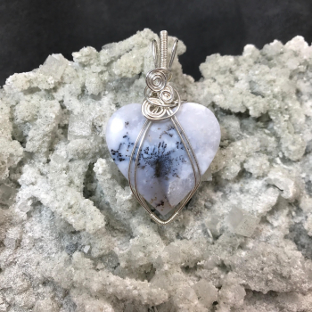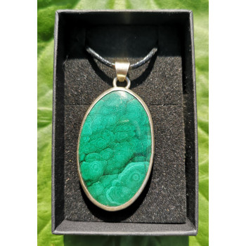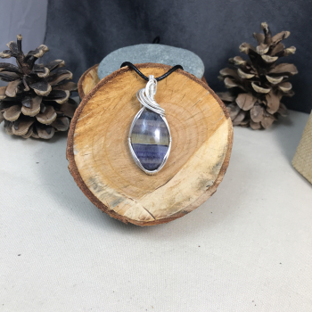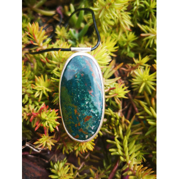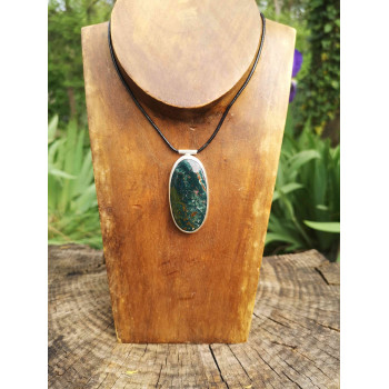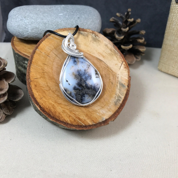 Jolie agate à dentrite d'Indonésie, très suggestive aux paysages, un arbre adossé sur une colline. Cette agate est sertie avec un fil de cuivre argenté (garantie sans plomb, sans nickel et sans cadmium) Dimension de la pierre nue : 35,85 x 29,92 mm Cordon polyester ciré, avec fermoir pince de...