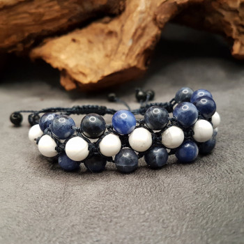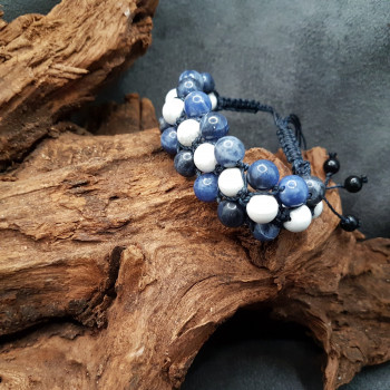 Bracelet technique shambala triple rangées, composé de perles 8mm de Sodalite et Howlite en son milieu, tressé sur fil ciré couleur Blue black hautement résistant dans le temps et à l'eau Finition par 4 petites perles 6mm bois de hêtre verni noir Taille ajustable par nœuds coulissants (shambala)