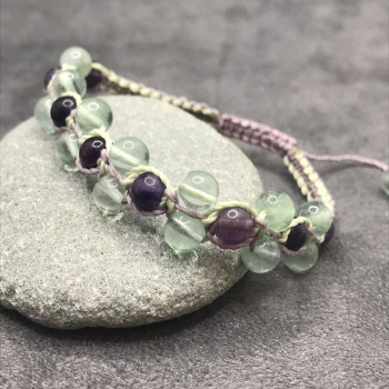Bracelet shambala composé de 24 perles de Fluorite 6mm, tressé sur fil ciré "vert pastel et mauve cendré" hautement résistant dans le temps et à l'eauFinition par 2 petites perles 6mm de Fluorite.taille ajustable par nœuds coulissants (shambala)