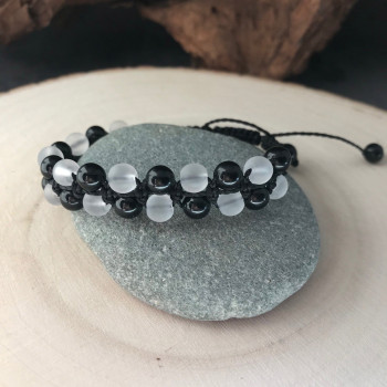 Bracelet technique shambala double rangée, composé de perles de Tourmaline noire et de Cristal de roche mat (dépolie) en 6mm, tressé sur fil ciré "noir" hautement résistant dans le temps et à l'eau. Bracelet très agréable à porter, très léger et doux. Finition par 2 petites perles 6mm Tourmaline...