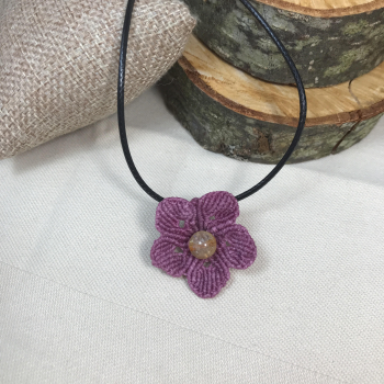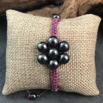Bracelet en forme de fleur avec 7 perles Hématite de 8mm et 2 perles d'Hématite de 6mm sur les côtés. Le tout est tressé sur fil mauve cendré, hautement résistant dans le temps et à l'eau. Finition par 2 petites perles 6mm en Hématite. Taille ajustable par nœuds coulissants (shambala)
