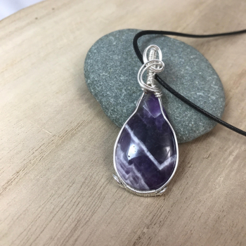 Sublime Améthyste chevron possédant des chevrons bien marqués. Elle est sertie sur fil de cuivre argenté (garantie sans plomb, sans nickel et sans cadmium) Dimension de la pierre nue : 35.7 x 21.17 mm Cordon polyester ciré, avec fermoir pince de homard et chainette d'extension
