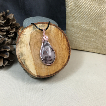 Superbe pendentif Quartz rose étoilé de qualité gemme. sertie sur fil de cuivre argenté (garantie sans plomb, sans nickel et sans cadmium) dimensions de la pierre : 30,51 x 16,39 cordon polyester noir ajustable avec chainette d'extension