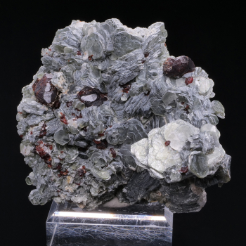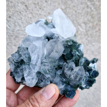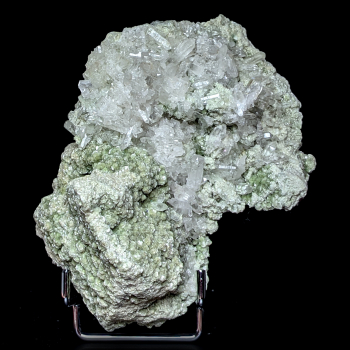 Cristaux de Prehnite formant comme des papillons d’un vert clair brillant, pour certains inclus d’Actinolite qui colorent les cristaux en vert très foncé. Spécimen provenant de Boulemane au Maroc.10 x 9,70 x 5,20 cmRéférence : 4013