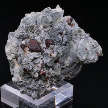 Cristal principal centimétrique, 1,30cm, de Clinohumite orange intense, associé à de plus petits cristaux, le tout sur gangue de Muscovite en pétales.8,80 x 7,80 x 5,80 cmRéférence : 2906