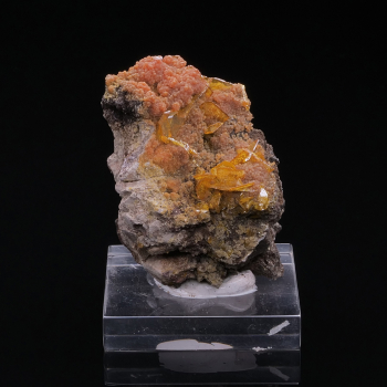 Très jolie pièce de Wulfénite aux cristaux limpides et orange associée à de la Mimétite orange plus foncé et opaque.4,70 x 4,10 x 3,80 cmRéférence : 3035
