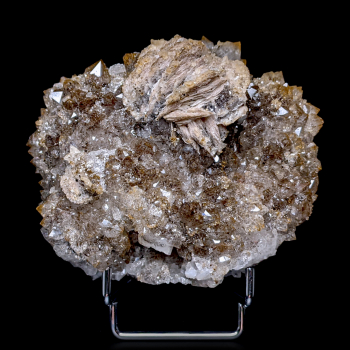 Hérisson de quartz brillant avec des cristaux riches en inclusions (probablement de goethite), surmonté par un pompon de baryte.Pièce provenant d'Aouli, Mibladen, Province de Midelt, Région du Drâa-Tafilalet, Maroc.Elle mesure 8,9 cm de large pour 7,6 cm d'épaisseur et 6 cm de large.Son poids est...