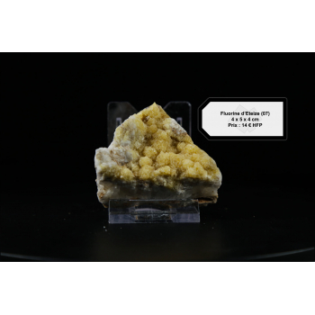 Fluorine d'Eteize – Ardèche (07) - FranceMinéraux : FluorineDimension (cm - L x l x H) : 4 x 5 x 4 cmPoids : 120 grammesPrix : 14 € Informations complémentaires : Pièce de fluorine jaune légèrement altérée provenant d'Eteize dans l'Ardèche. Si vous avez des questions, n'hésitez pas à me contacter.