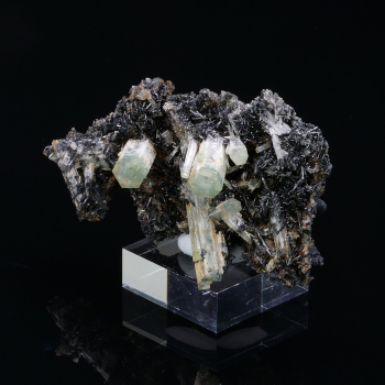 Spécimen découvert dans l’Erongo en Namibie. Il présente des cristaux de Béryl capés vert associés à de petits cristaux de Schorl, ainsi que des cristaux botryoidaux de Coronadite sur le dessous de la pièce. Spécimen atypique et rare de l’Erongo.8,40 x 3,90 x 3,80 cmRéférence : 3422