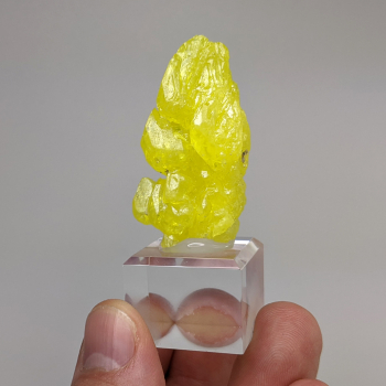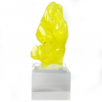 Groupe de cristaux de soufre jaune vif avec quelques cristaux bien définis.Il provient de la mine Desierto, Potosi, Bolivie.Cette pièce pèse 11,5 grammes.Elle mesure 4,1 cm de long pour 2,3 cm de large et 2,1 cm au plus épais.A noter une casse distinguable à l'arrière en haut. Référence :...