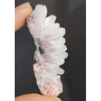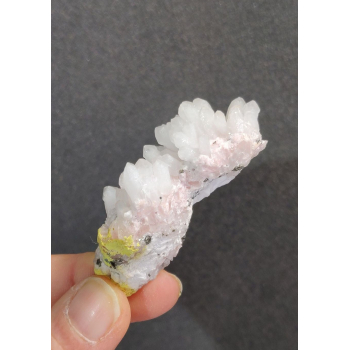 Quartz, Blende, Rhodocrosite Cavnic RoumanieQuartz à l'intérieur limpide, sur rhodocrosite à inclusions de blende et de chalcopyrite. Les traces jaunes correspondent à de la "patafix" et peuvent être nettoyées.