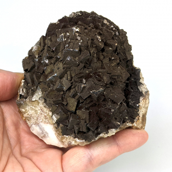 Pièce peu fréquente de fluorite jaune recouverte par un enduit couleur chocolat, sur une gangue de quartz blanc massif.Elle provient de la mine de L'Argentolle, Saint-Prix, Saône-et-Loire, Bourgogne-Franche-Comté, France.D'un poids de 429 grammes, cet échantillon mesure 7,9 cm de long pour 8,4 cm...