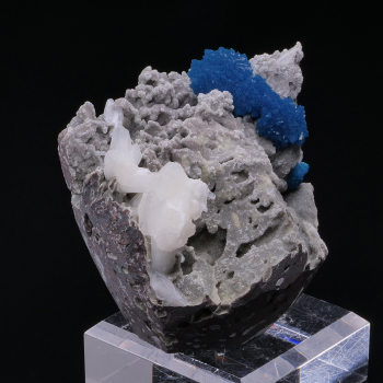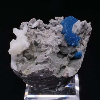 Géode avec d’un côté des pompons de cristaux de Cavansite bleu électrique parfaitement formés et de l’autres des cristaux de Stilbite presque incolores qui contrastent et apportent de la lumière à la pièce.7,20 x 6,40 x 6 cmRéférence : 3050